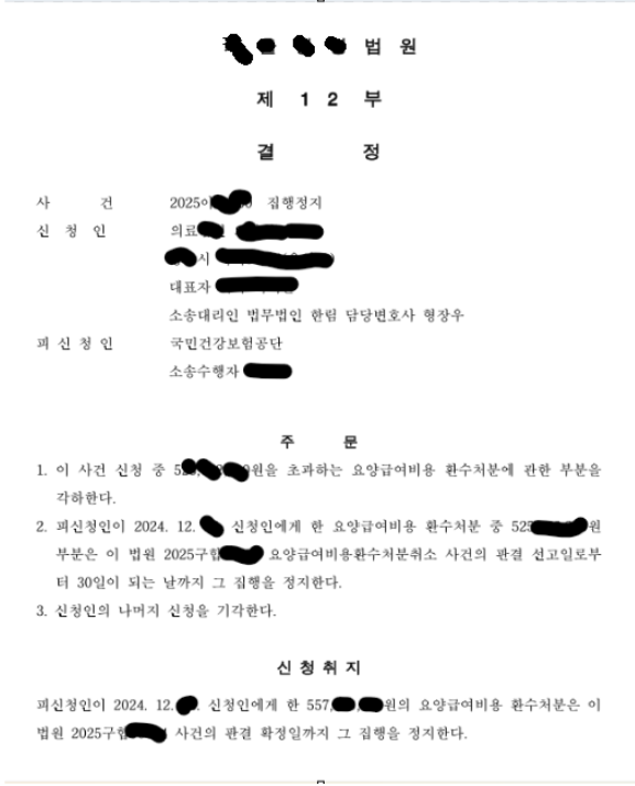 이와 관련해서 작년 12월 경 지방에 있는 중형병원도 5억 원이 넘는 많은 금액에 대한 환수(상계)결정이 있게 되었고 1월 초에 이러한 환수결정에 대한 취소소송(행정소송)을 제기하면서 일단 그 소송이 끝날때까지만이라도 환수결정의 "집행을 정지시켜달라는 신청"을 하였는데, "다행히도 집행정지결정"을 받았기에 아래에 결정문 중 일부를 소개할까 합니다. 다만 이미 3천만원이 넘는 돈은 환수(상계)가 되어버려서 그 부분은 정지시킬 대상이 없다는 이유로 받아들여지지 않았습니다. 집행정지사건에서는 환수처분의 적법성 여부보다는 지금 당장 꼭 환수처분을 해야하는가...의 관점이 더 중요하기 때문에 본안 사건에서도 좋은 결과를 얻기 위해서는 앞으로도 좀 더 사실관계를 검토할 필요는 있어보입니다. EMR이라든지 모니터링의 방법, 진료지원시스템 등 병원내부의 행정부분까지도 알아야 할 필요가 있었습니다. 그렇더라도 일단은 상당기간 동안 병원 운영은 정상적으로 될 것이어서 다행이라는 생각입니다.